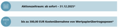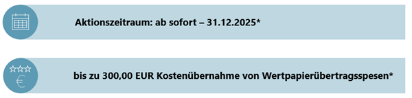 *) Die easybank vergütet insgesamt Übertragungsspesen bis zu max. 300,00 EUR pro Depot gegen Vorlage einer detaillierten Spesenaufstellung der Fremdbank (Abrechnungsbelege der übertragenen Positionen/Wertpapiere bitte an b2b@easybank.at senden). Für Wertpapierpositionen, deren Wert unter 3.000,00 EUR liegt, werden keine Spesen erstattet. Die Aktion gilt für neue und bestehende Kunden.