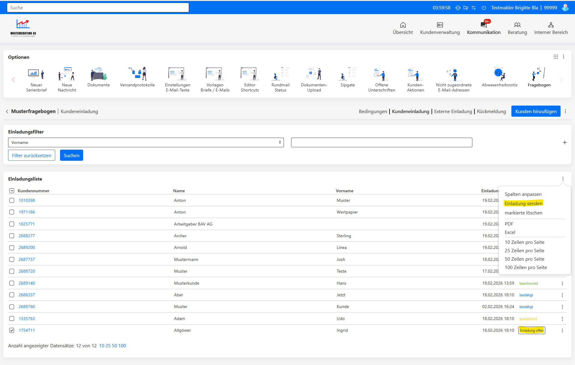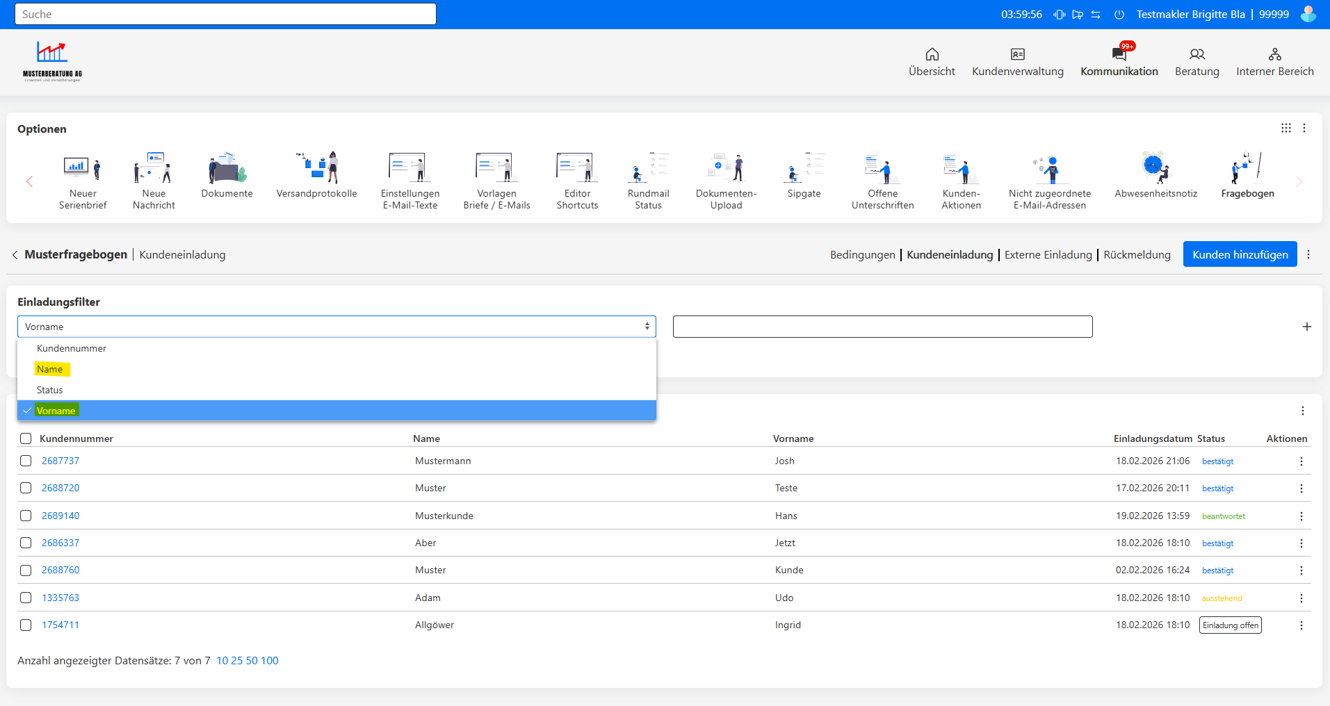 Im Fragebogentool wurde bei den Einladungen eine Filterfunktion nach Name und Vorname ergänzt. Zusätzlich wird die Einladungs-E-Mail nicht mehr sofort nach der Erfassung verschickt, sondern erhält den neuen Status „Einladung offen“. Berater können so zunächst eine Liste von Empfänger aufbauen und die Einladungen dann gebündelt per Klick versenden.