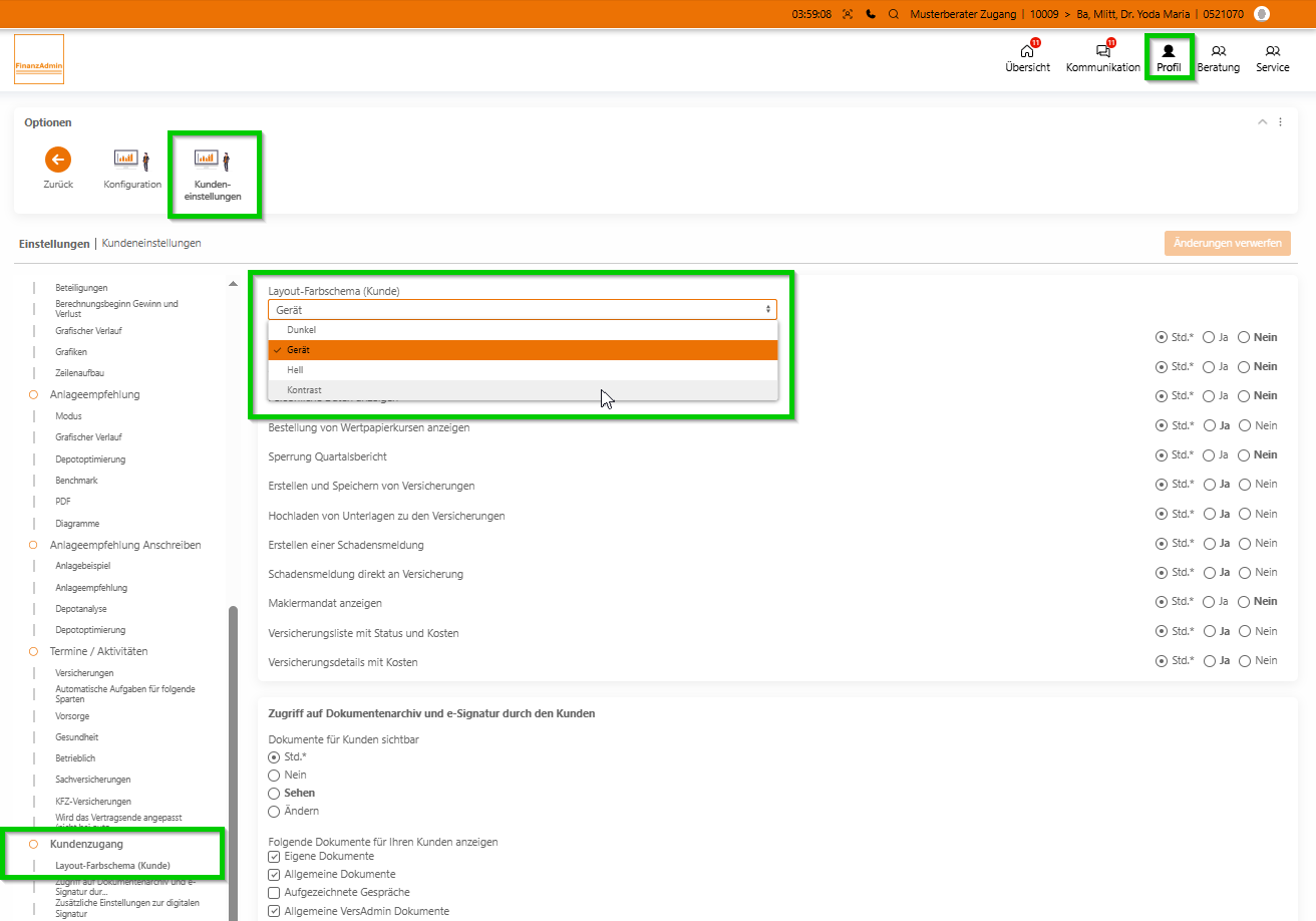 Kundenebene -> Profil -> Einstellungen -> Kundeneinstellungen -> Kundenzugang -> Layout-Farbschema (Kunde) -> Kontrast