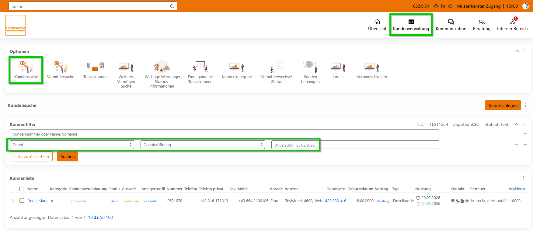 Damit können Sie gezielt nach Kundinnen und Kunden suchen, deren Depot innerhalb eines definierten Zeitraums eröffnet wurde. Dies erleichtert insbesondere Auswertungen, Vertriebsansätze sowie Bestandsanalysen erheblich.