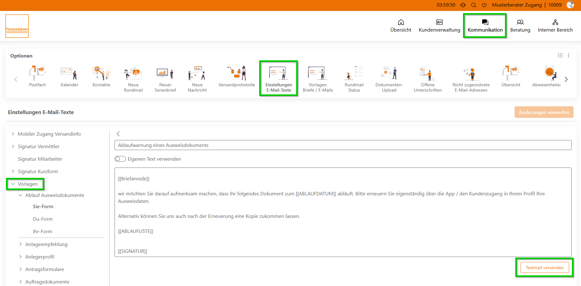Sie können jetzt ganz einfach einen Testmailversand auslösen – sowohl für die Standardtexte als auch für individuell angepasste Vorlagen.