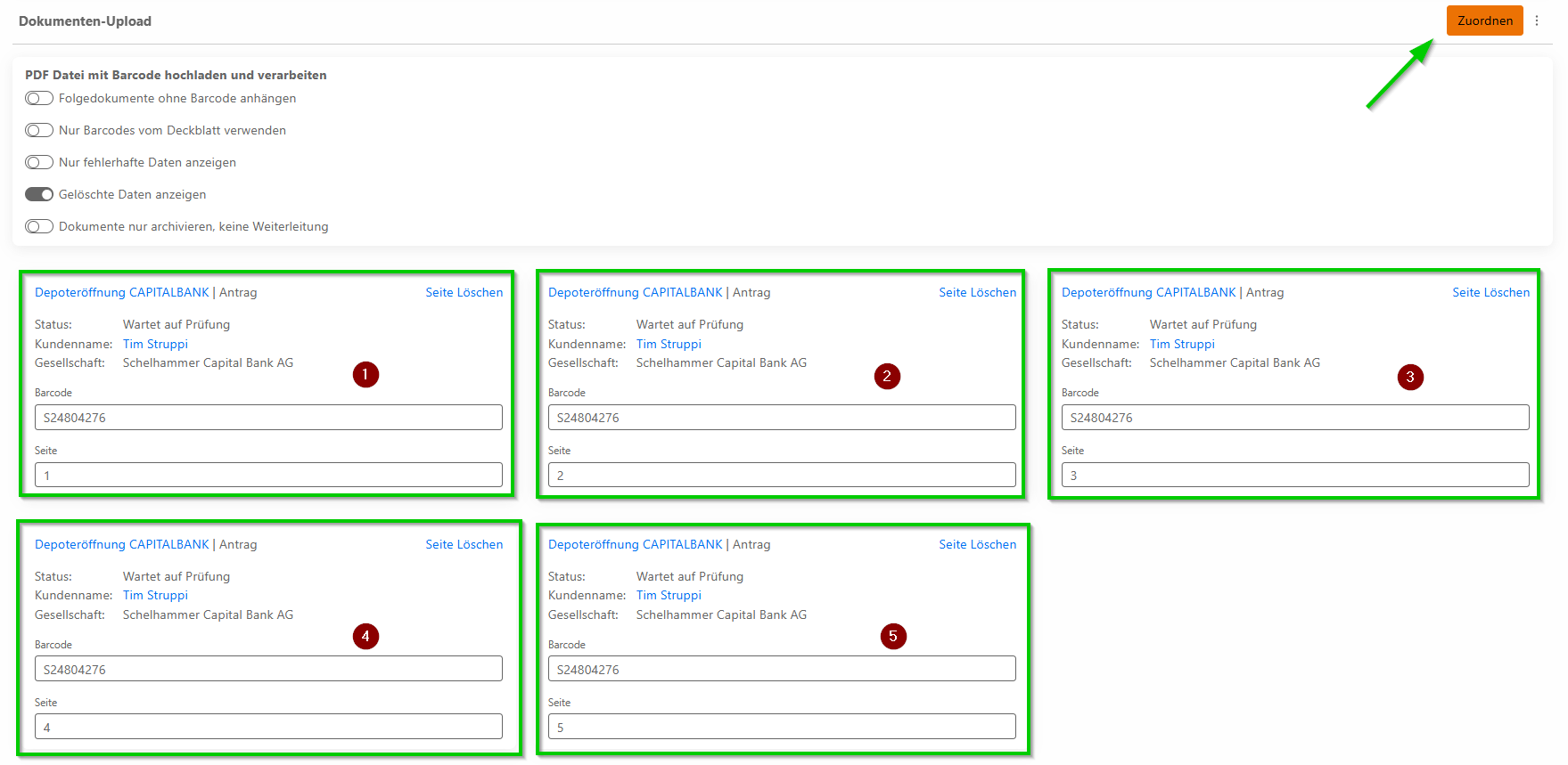 - Alle 5 Seiten müssen gemeinsam als EIN Dokument hochgeladen und per Klick auf „Zuordnen“ an uns übermittelt werden.