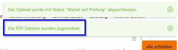 Die Übermittlung an uns ist erfolgreich, wenn die Meldung „Die PDF Dateien wurden zugeordnet.“ erscheint.